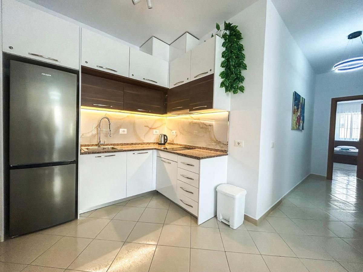 Kuchyňský kout: Plně vybavená kuchyňská linka se spotřebiči – velká lednice s mrazákem, dvouplotýnková keramická varná deska, digestoř, mikrovlnná trouba, varná konvice a základní nádobí.